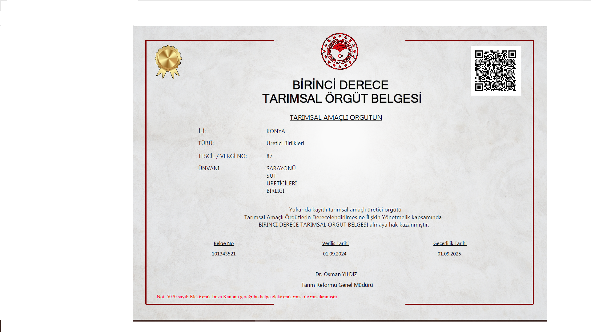 Birinci Derece Tarımsal Örgüt Belgesi alınmıştır.